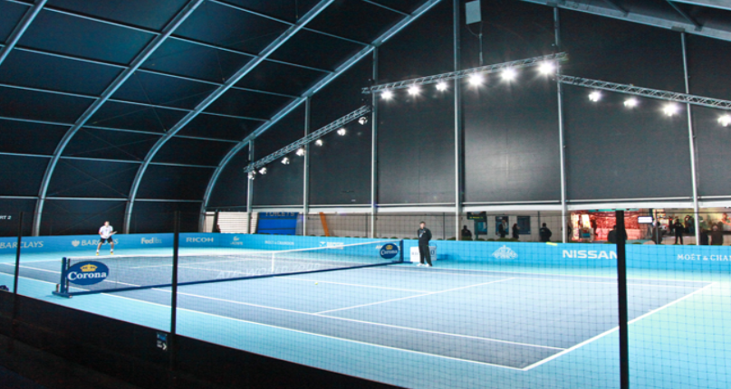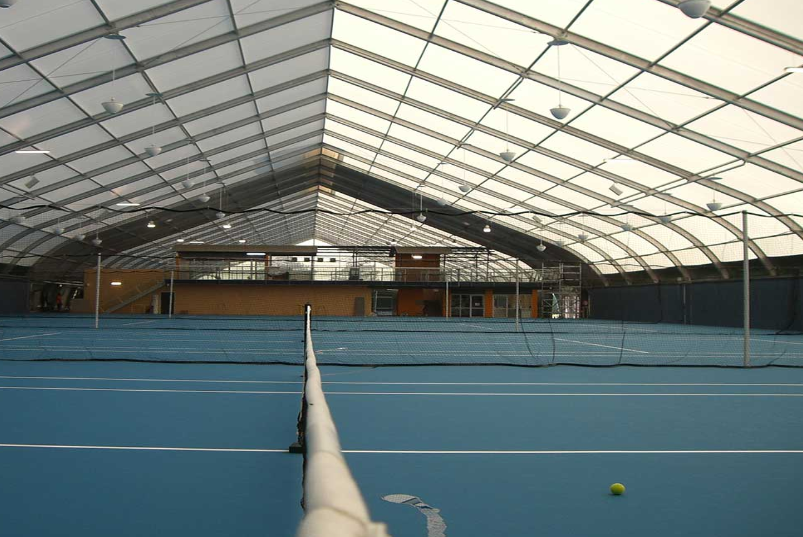 技术领域:本实用新型涉及雨棚,特别涉及一种网球场用耐腐蚀自动开合雨棚。背景技术:雨棚是指设在建筑物出入口或阳台上方用来挡雨、挡风、防高空落物砸伤人的一种遮雨装置,现有的网球场雨棚往往采用手摇式对雨棚进行开合,极大地造成了时间和体力的浪费。对此需要设计一种网球场用耐腐蚀自动开合雨棚。本实用新型公开了一种网球场用耐腐蚀自动开合雨棚,包括支撑架本体和底座,支撑架本......
