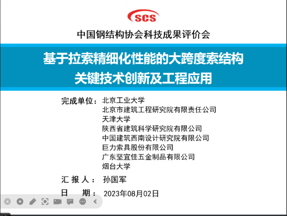 8月2日,中国钢结构协会组织召开“拉索性能精细化研究与大跨度索结构关键技术创新应用”科技成果评价视频会。该项目由北京工业大学、北京市建筑工程研究院有限责任公司、天津大学、陕西省建筑科学研究院有限公司、中国建筑西南设计研究院有限公司、巨力索具股份有限公司、广东坚宜佳五金制品有限公司、烟台大学等单位共同完成。