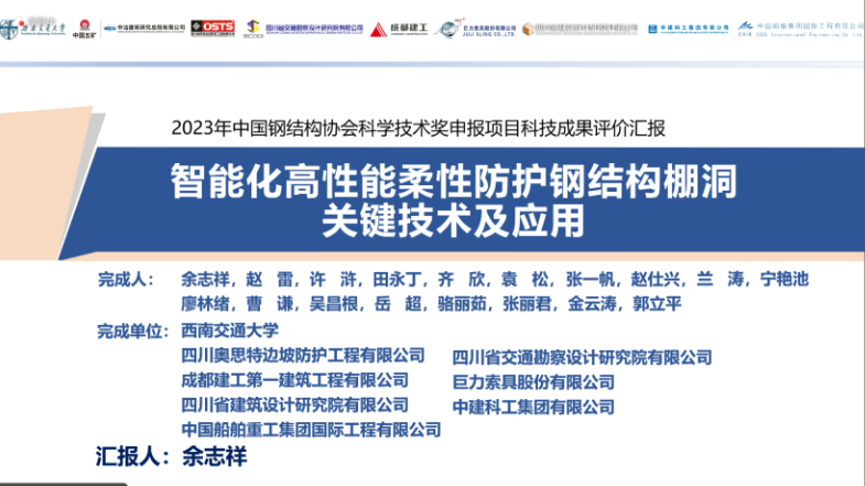 2023年7月29日,中国钢结构协会组织召开“高性能钢结构柔性防护棚洞关键技术及应用”科技成果评价视频会。该成果由西南交通大学、四川奥思特边坡防护工程有限公司、四川省交通勘察设计研究院有限公司、四川省建筑设计研究院有限公司、成都建工第一建筑工程有限公司、巨力索具股份有限公司、中建科工集团有限公司、中国船舶重工集团国际工程有限公司等单位共同完成。