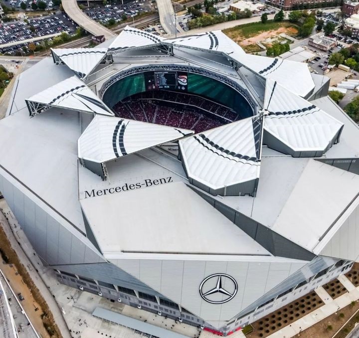 梅赛德斯奔驰文化中心原为世博演艺中心,是一个多功能体育场。文化中心建造耗时三年,耗资十五亿美元。其开合屋顶设计理念来自于猎鹰翅膀,是最大的设计亮点。顶部为刚性旋转型开合屋顶,由八片刚性结构单元构成,采用空间桁架结构体系,上部覆盖ETFE充气膜??羰备鞯ヌ逖刈鸥鞲龉斓劳揭贫?,整个开合过程就像相机光圈,每次开启仅需要8分钟。