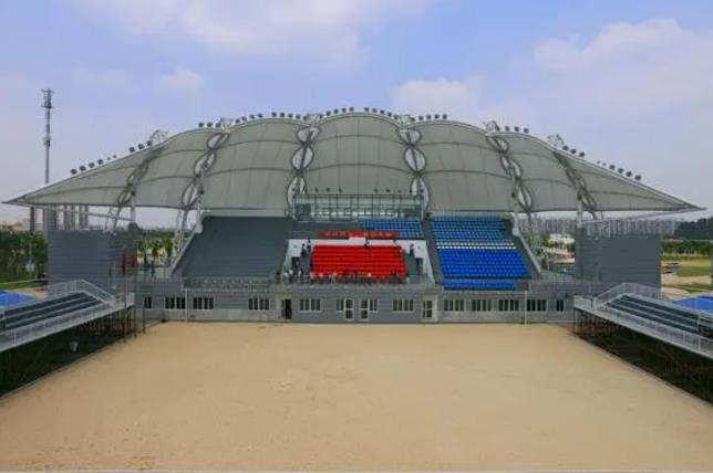 广州亚运城沙滩排球场,赛时总座位数为3030座,其中1000为固定座位(赛后保留),2030为临时座位(赛后拆除)。钢筋混凝土框架结构,部分屋面为钢桁架膜结构,总建筑面积3946㎡。赛时功能:沙滩排球。