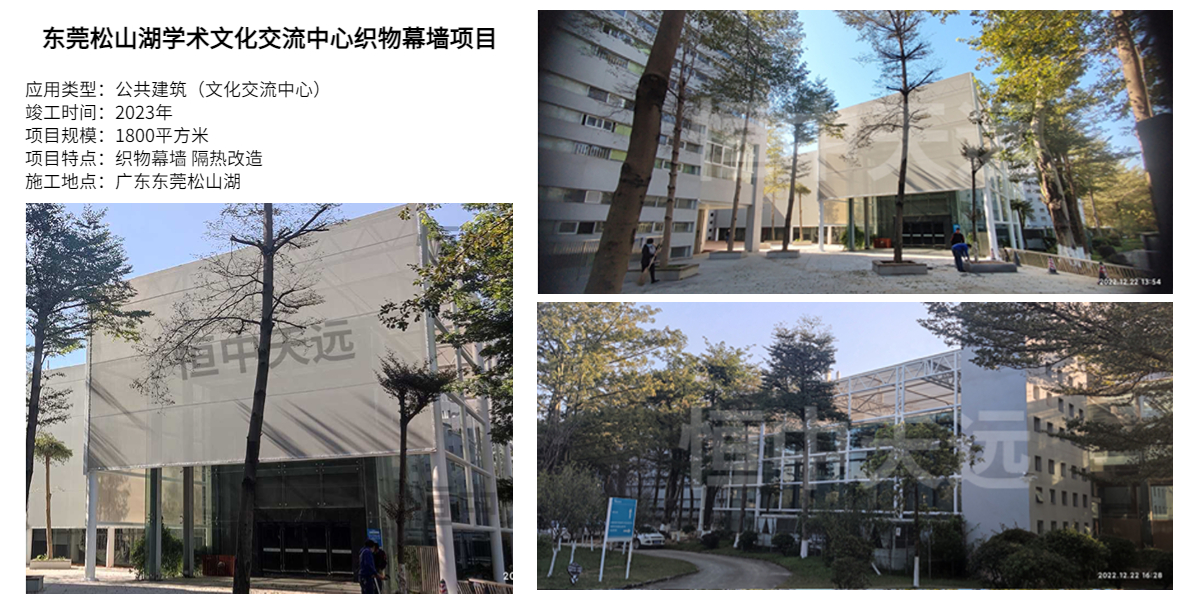 深圳恒中天远作为织物幕墙建筑工程行业知名企业,在织物幕墙建筑工程领域,恒中天远借助数十年织物材料研发投入,以及跟各大建筑设计院、美术学院保持着良好的合作关系,在建筑幕墙行业中默默耕耘织物幕墙细分领域,并积累大量配套织物幕墙工程经验,以满足现代化建筑外立面幕墙多样性设计需求。我们拥有专业的织物幕墙外立面设计团队和施工团队,可以满足不同类型建筑的织物幕墙设计和施工需求。代表案例:东莞松山湖学术文化交流中心织物幕墙工程项目、造甲乡农业科技展示中心织物幕墙工程项目等。